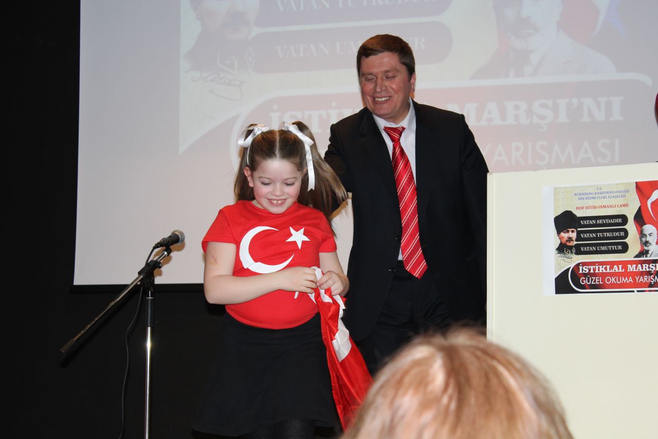 HOF’TA İSTİKLAL MARŞI COŞKUSU İstiklal Marşının kabulünün 97. Yılı münasebetiyle Nürnberg Din Hizmetleri Ataşeliği Hof DİTİB Osmanlı Camii tarafından 30 öğrencinin katılımı ile İstiklal Marşını Güzel Okuma Yarışması düzenlendi. ![]() Saygı duruşu ve İstiklal Marşı’nın okunmasıyla başlayan programda Hof DİTİB Bayan Din Görevlisi Gönül Çakan İstiklal Marşının kabulü ve Mehmet Akif Ersoy hakkında bilgi verdi. ![]() Yoğun katılımın olduğu, duygulu ve heyecanlı anların yaşandığı yarışmada küçüklerden birinciliği Sara Ela Kamalak, büyüklerde ise Merve Eren aldı. ![]() Din Görevlisi Güngör Çakan, yapılan yarışma ile cami derslerine devam eden öğrencilerin, Türk dilini doğru, etkili ve kurallarına uygun olarak konuşmaya özendirerek dilin güzel ve düzgün kullanma yeteneğini geliştirmek ve İstiklal Marşını sevdirmek; öğrencilere toplum karşısında kendilerini ifade etme becerisi ve özgüven kazandırmayı amaçladıklarını beyan etti. ![]() |